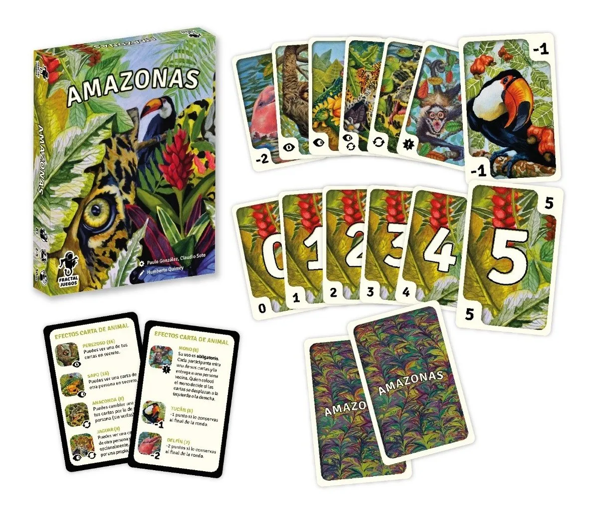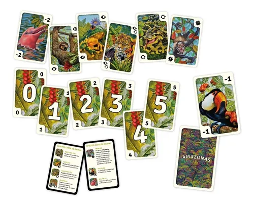 La selva guarda innumerables secretos. Entre su colorida vegetación se esconden distintos animales. Amazonas es un juego de memoria y agilidad. Durante cinco rondas cada participante intentará obtener el menor puntaje recordando, descartando e intercambiando cartas.